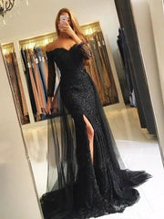 Trumpet/Mermaid Long Sleeves Off-the-Shoulder Sweep/Brush Train Tulle Lace Dresses - Black