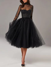 A-Line Cocktail Black Dress Vintage Dress Homecoming Cocktail Party Knee Length Long Sleeve High Neck Wednesday Addams Family Tulle with Pleats - US 2 / UK 6 / EU 32