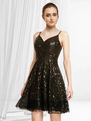 A-Line Glittering Sexy Homecoming Party Wear Dress V Neck Sleeveless Short Mini Lace Sequined with Pleats Sequin