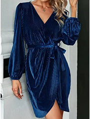 Homecoming Dress Velvet Dress Cocktail Dress Mini Dress Wine Dark Green Dark Blue Long Sleeve Pure Color Lace up Fall Winter V Neck Wedding Guest