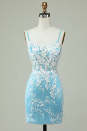 Light Blue Sheath Spaghetti Straps Short Homecoming Dress with Appliques Flowers