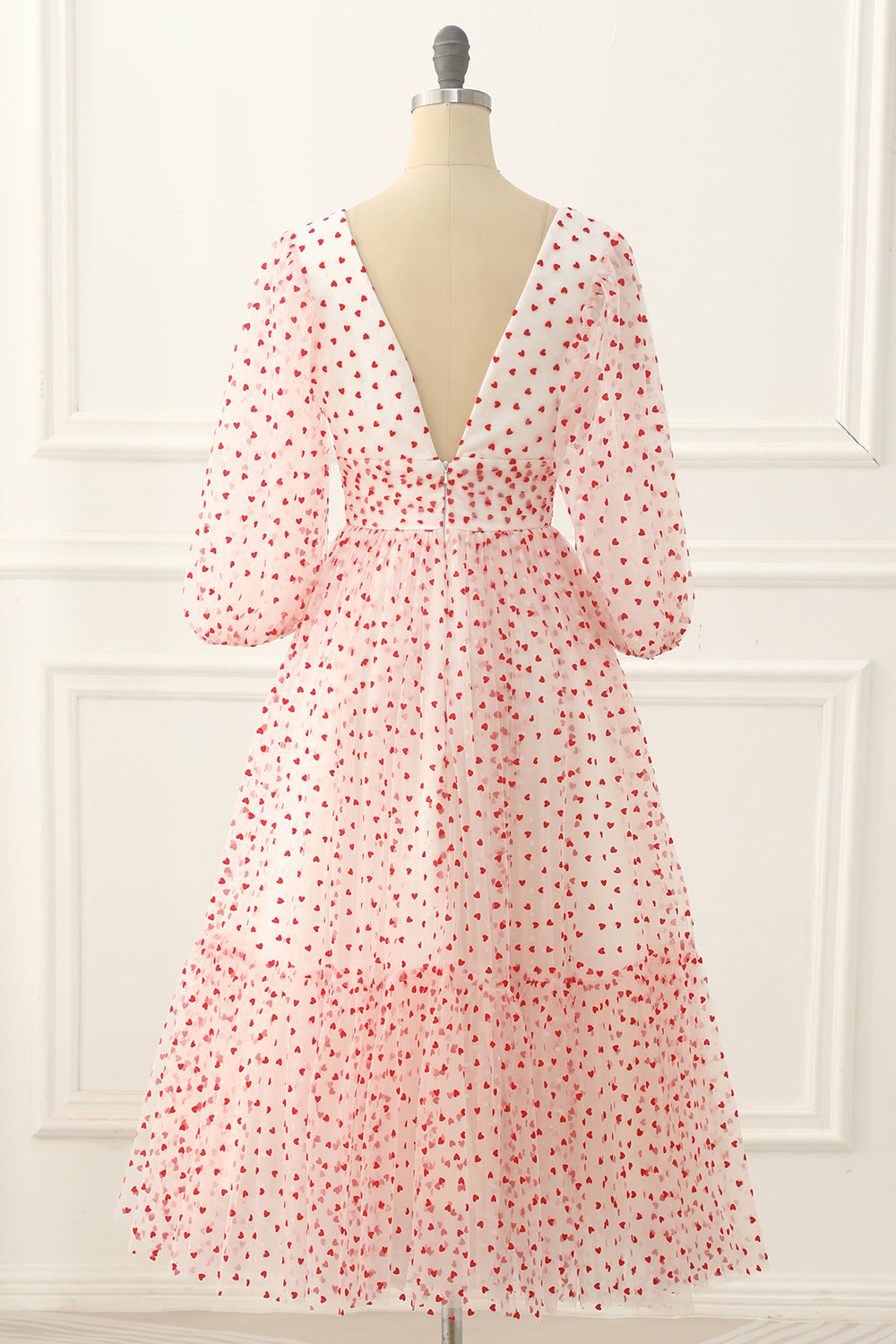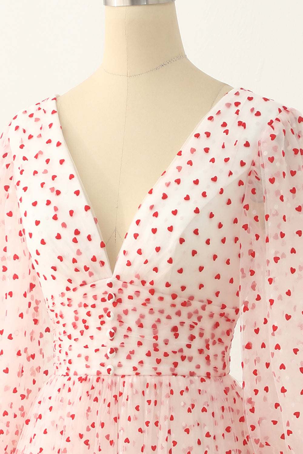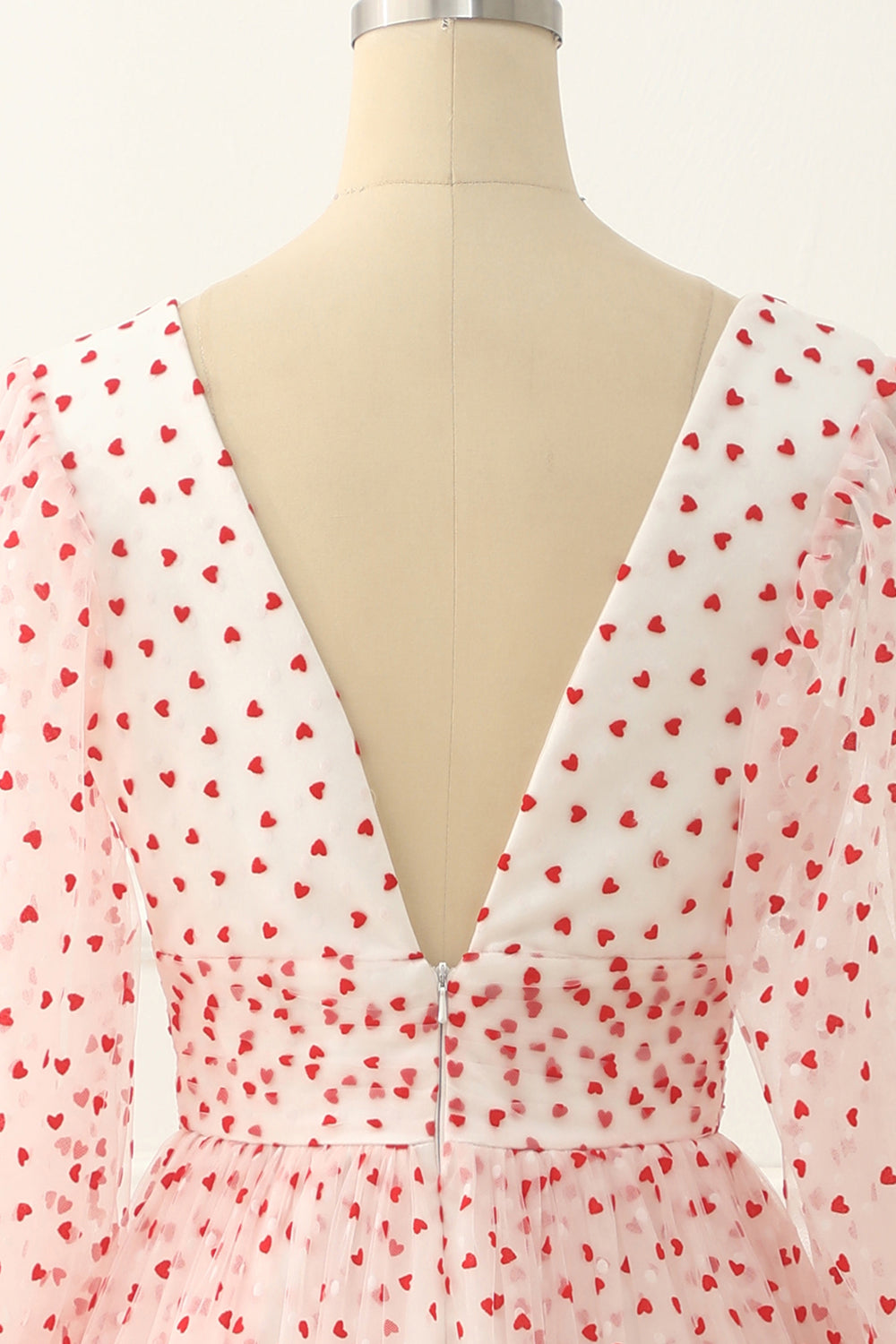 Tulle V-Neck A-Line Long Sleeves Prom Dress With Hearts Beautiful Homecoming Dress