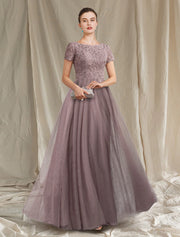 A-Line Mother of the Bride Dress Elegant Luxurious Jewel Neck Floor Length Lace Tulle Short Sleeve with Pleats Appliques
