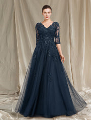 A-Line Mother of the Bride Dress Elegant Luxurious V Neck Floor Length Chiffon Lace Tulle Half Sleeve with Sequin Appliques