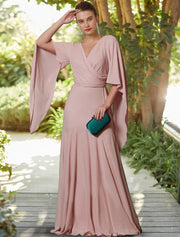 A-Line Mother of the Bride Dress Formal Wedding Guest Elegant V Neck Floor Length Chiffon Long Sleeve with Pleats