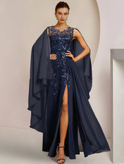 A-Line Mother of the Bride Dress Formal Wedding Guest Elegant V Neck Floor Length Chiffon Sequined Sleeveless with Appliques Split Front
