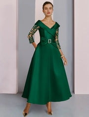 A-Line Mother of the Bride Dress Formal Wedding Guest Elegant V Neck Tea Length Satin Lace Sequined 3/4 Length Sleeve with Bow(s) Crystal Brooch