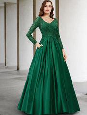 A-Line Mother of the Bride Dress Luxurious Elegant V Neck Floor Length Chiffon Lace Long Sleeve with Pleats Appliques