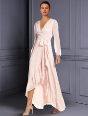 A-Line Mother of the Bride Dress Wedding Guest Elegant High Low V Neck Asymmetrical Tea Length Chiffon Long Sleeve with Ruched Split Front