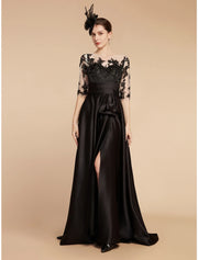 A-Line Mother of the Bride Dress Wedding Guest Elegant Party Jewel Neck Sweep / Brush Train Satin Lace Half Sleeve with Split Front Ruching Solid Color