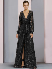A-Line Mother of the Bride Dress Wedding Guest Elegant Sparkle & Shine V Neck Floor Length Lace Sequined Long Sleeve with Sequin Appliques Split Front - US 2 / UK 6 / EU 32