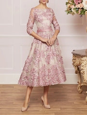 A-Line Plus Size Bateau Neck Tea Length Wedding Guest Party Dress Lace Half Sleeve Mother of the Bride Dress with Lace Sash / Ribbon - Dusty Rose