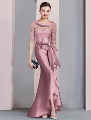 Mermaid / Trumpet Mother of the Bride Dress Formal Fall Wedding Guest Dresses Elegant High Low Scoop Neck Sweep / Brush Train Asymmetrical Satin Lace Half Sleeve with Bow(s) Appliques - Wisteria
