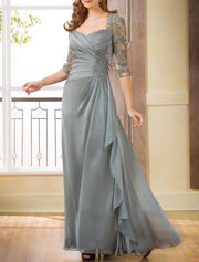 Sheath A-Line Trumpet Mother of the Bride Dress Elegant Jewel Neck Wedding Guest Floor Length Chiffon 3/4 Length Sleeve with Ruched Appliques Split