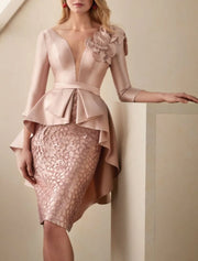 Sheath / Column Bateau Neck Knee Length Wedding Guest Satin 3/4 Length Sleeve Mother of the Bride Dress with Pleats Flower