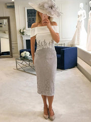 Sheath/Column Lace Appliques Off-the-Shoulder Sleeveless Tea-Length Mother of the Bride Dresses