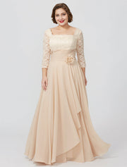 Sheath / Column Mother of the Bride Dress Formal Classic & Timeless Elegant & Luxurious Plus Size Square Neck Floor Length Chiffon Metallic Lace 3/4 Length Sleeve No with Sash / Ribbon Flower