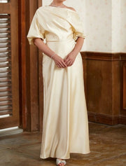 Sheath / Column Mother of the Bride Dress Off Shoulder Sweep / Brush Train Satin Half Sleeve with Ruching - Champagne
