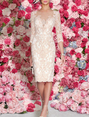 Sheath / Column Plus Size Bateau Neck Knee Length Wedding Guest Lace 3/4 Length Sleeve Mother of the Bride Dress with Pleats Appliques - US 2 / UK 6 / EU 32