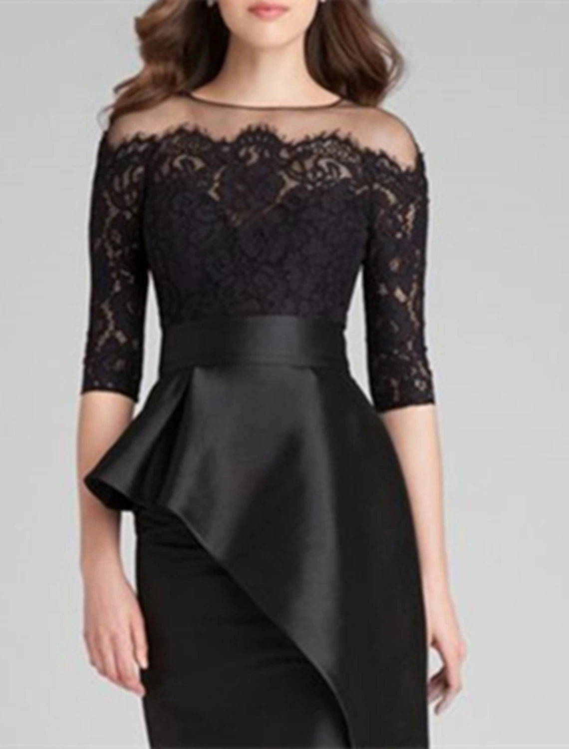 Sheath Mermaid Simple Jewel Neck Floor Length Wedding Guest Satin Lace Half Sleeve with Ruffles Mother of the Bride Dress Appliques - US 2 / UK 6 / EU 32