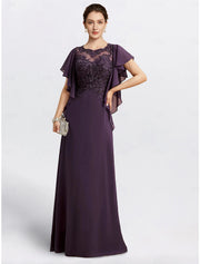 Sheath Mother of the Bride Dress Cape Dress Formal Wedding Guest Elegant Jewel Neck Floor Length Chiffon Short Sleeve with Beading Appliques
