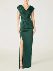 Slim fit/column V-neck sleeveless and ground length ruffled edge mother of the bride dresses With Slit