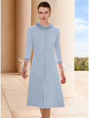 Two Piece Sheath / Column Mother of the Bride Dress Wedding Guest Elegant Petite Scoop Neck Knee Length Satin 3/4 Length Sleeve with Feather Beading