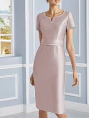 Two Piece Sheath / Column Mother of the Bride Dress Wedding Guest Jewel Neck Knee Length Satin Short Sleeve with Pearls - US 2 / UK 6 / EU 32