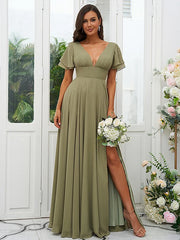 A-Line/Princess Chiffon Ruffles V-neck Short Sleeves Floor-Length Bridesmaid Dresses Party Dresses Wedding Guest Dresses
