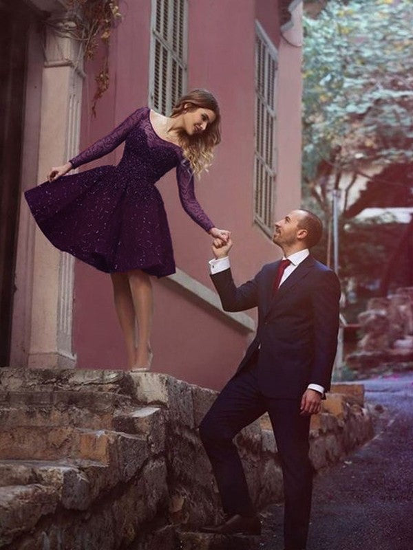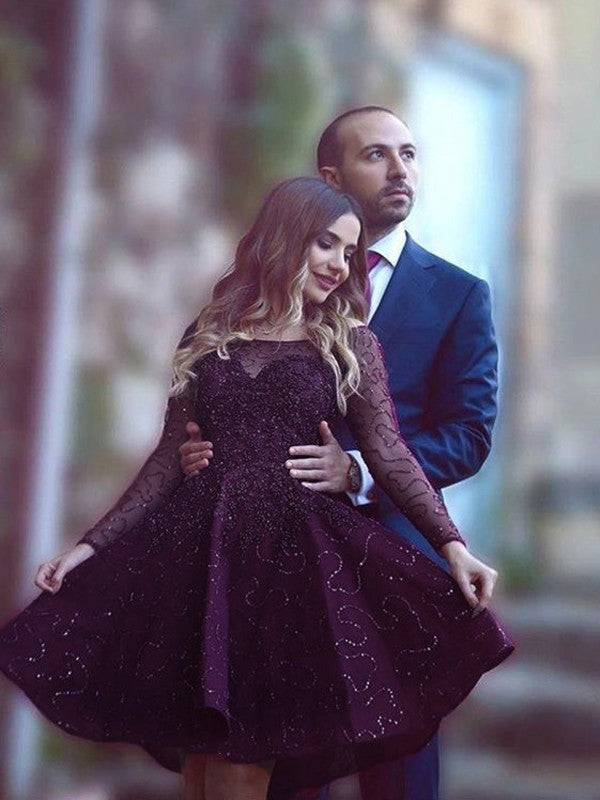 A-Line/Princess Long Sleeves Scoop Paillette Lace Short/Mini Dresses