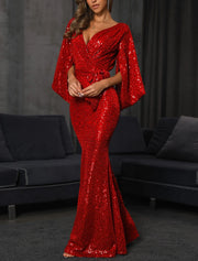 Sheath Mermaid Sleek Glitter Sparking Sequins Evening Gown V Neck Formal Wedding Guest Dress Floor Length Long Sleeve Prom Dress With Bow