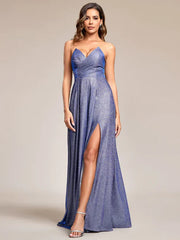 Shimmering Strapless A-Line Pleated Back-Laced High Slit Evening Dress/Prom Dresses