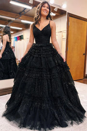 A Line  Ball Gown V Neck Sparkly Black Tulle Long Prom Dresses
