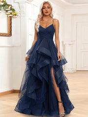 A-Line Evening Gown Elegant Dress Formal Wedding Guest Sweep / Brush Train Sleeveless Spaghetti Strap Organza with Ruched Ruffles Slit - US 2 / UK 6 / EU 32