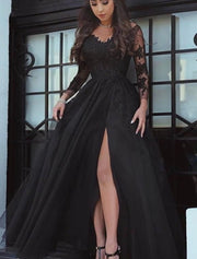 A-Line Evening Gown Floral Dress Wedding Guest Formal Evening Floor Length Long Sleeve V Neck Wednesday Addams Family Lace with Slit Lace Insert - Black