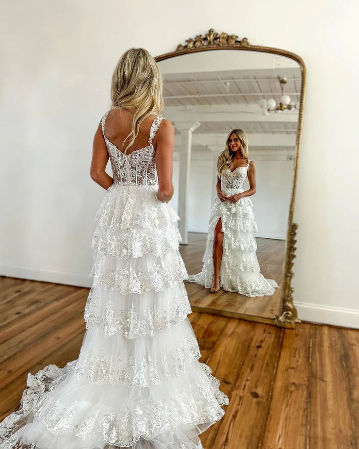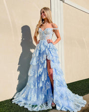 A Line Off the Shoulder Light Blue Sequins Lace Layers Long Prom Dresses with Slit