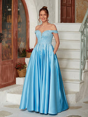 A-Line/Princess Satin Lace Off-the-Shoulder Sleeveless Floor-Length Dresses