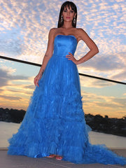 A-Line Princess Strapless Tulle Ruffles Sleeveless Prom Dresses