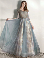 A-Line Prom Dresses Elegant Dress Engagement Floor Length Half Sleeve V Neck Tulle with Pleats Pattern / Print Appliques