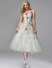 A-Line Prom Dresses Floral Dress Wedding Guest Engagement Tea Length Sleeveless Jewel Neck Chiffon with Lace Insert Appliques - Ivory