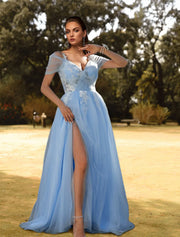 A-Line Prom Dresses Floral Dress Wedding Guest Sweep / Brush Train Short Sleeve V Neck Tulle with Slit Appliques