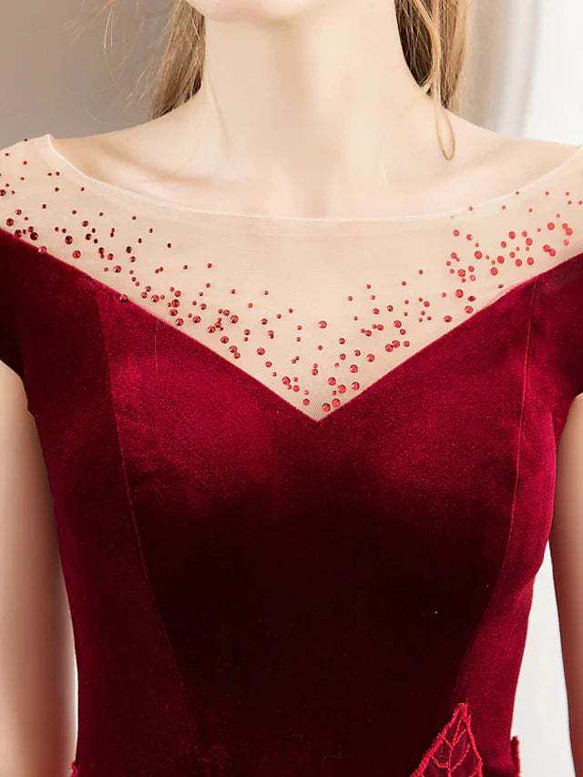 A-Line Prom Dresses Glittering Dress Engagement Floor Length Short Sleeve Jewel Neck Tulle with Pleats Crystals Pattern / Print