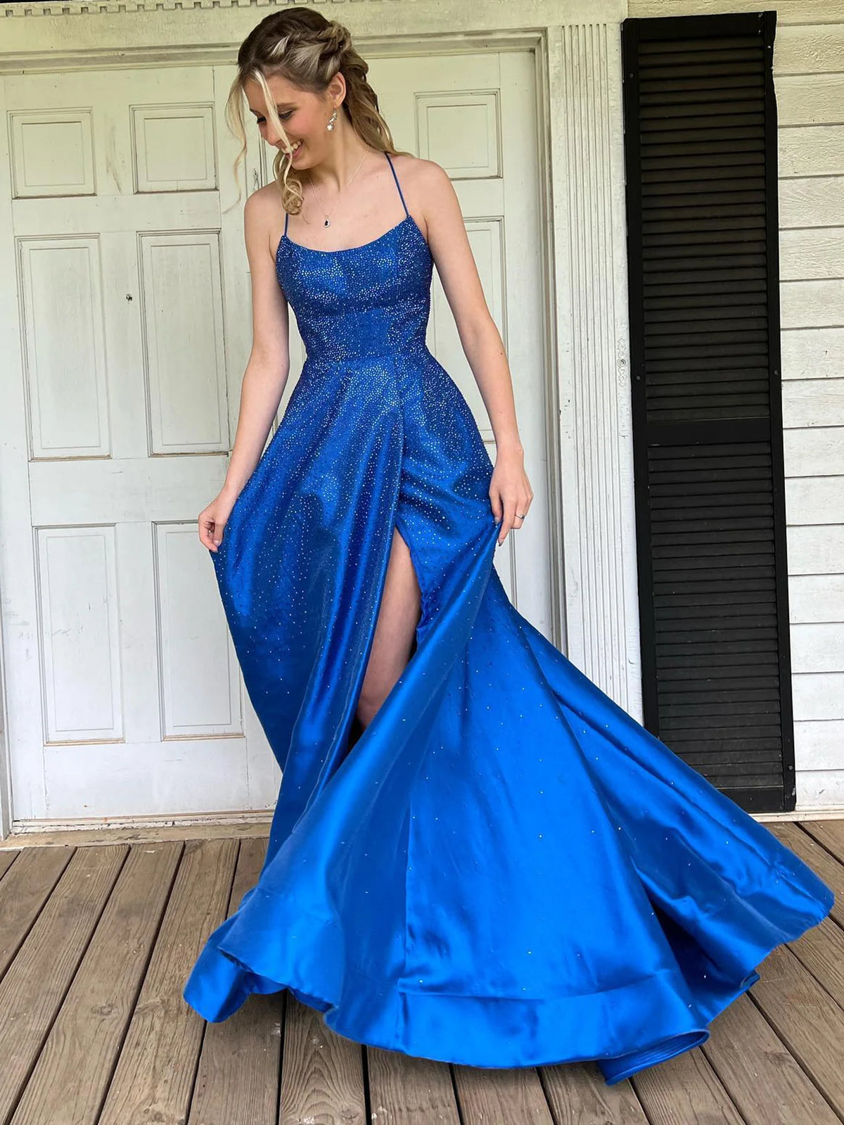 A Line Spaghetti Straps Open Back Prom Dress With Beading