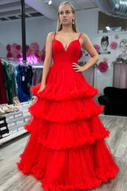 A Line Spaghetti Straps V Neck Red Tulle Layers Long Prom Dresses