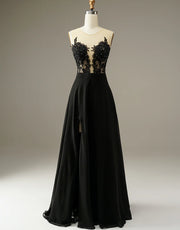 A-line Strapless Black Split Long Prom Dress with Appliques Beading