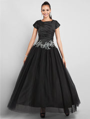 Ball Gown Little Black Dress Dress Prom Formal Evening Ankle Length Short Sleeve Jewel Neck Taffeta with Appliques Side Draping