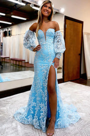 Blue Detachable Sleeves Sweetheart Lace Long Prom Dress with Slit Off Shoulder Beautiful - Light Blue