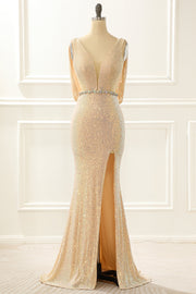 Champagne Sequins Long Prom Dress With Slit V-neck Sexy Sparkly