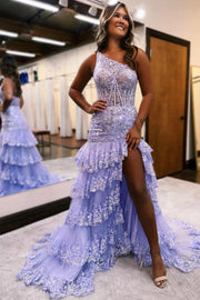 Mermaid Lace Appliques One Shoulder Sequins Lace Long Prom Dress with Slit Sparkly