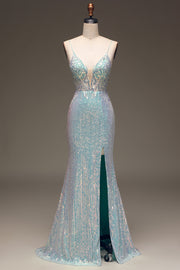 Mermaid Spaghetti Straps Long Prom Dress With Slit Sparkly Evening Party Dress